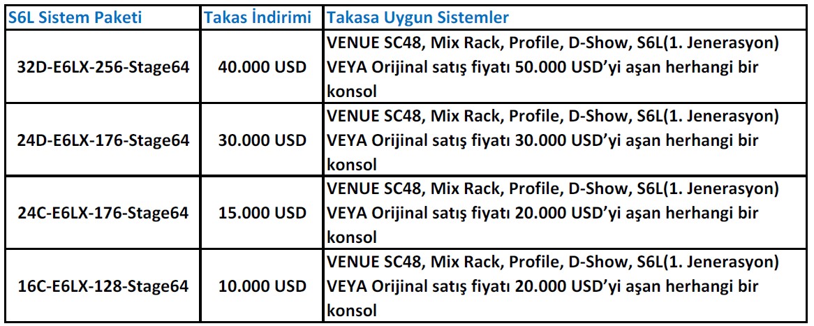* Takas Kampanyasına Uygun Ürünler Tüm AvidVENUE sistemleri (SC48, Profile, D-Show, Mix Rack, 1. nesil S6L) veya; üretici satış liste fiyatı (MSRP) 20.000 USD ve üzerinde olan tüm (third-party) mikser / konsollar